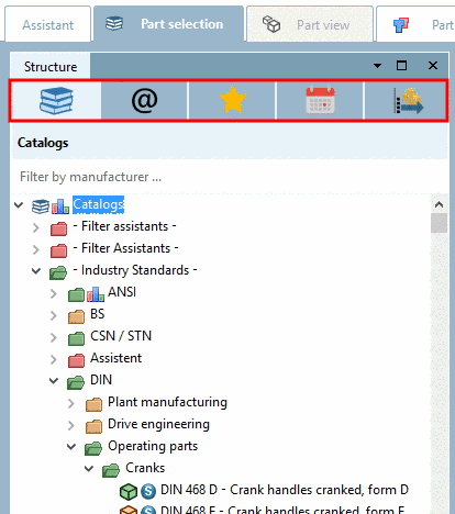 The area below the tabs (Assistant, Part selection (with subitems Catalogs , Classifications , Favorites , History , Document scan ), Part view , Part comparison , Cloud Navigator , Search results ) is controlled by them.