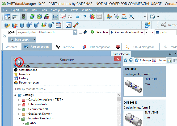 Fig. „ Part selection: Starting interface of PARTdataManager“ shows the starting user interface of PARTdataManager. There you can return anytime via click on the tab Part selection whereby the lastly shown selection (see next point) is shown again, not necessarily