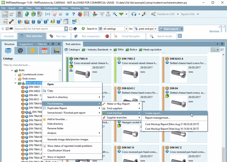 Call the report creation via context menu command Purchineering -> Cost mockup -> Create report..., alternatively via Extras menu -> Purchineering -> Cost mockup -> Create report....
