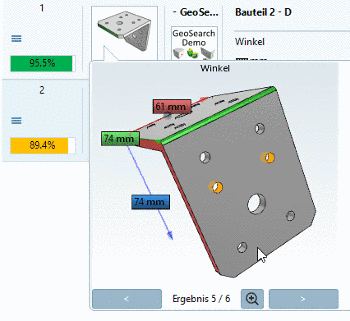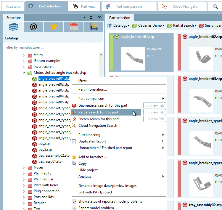 The Partial search is a geometrical search. However, not parts are used as reference, but individual features such as plane, cylinder, etc. And then parts containing these features are found. The geometrical arrangement of features is also taken into account.