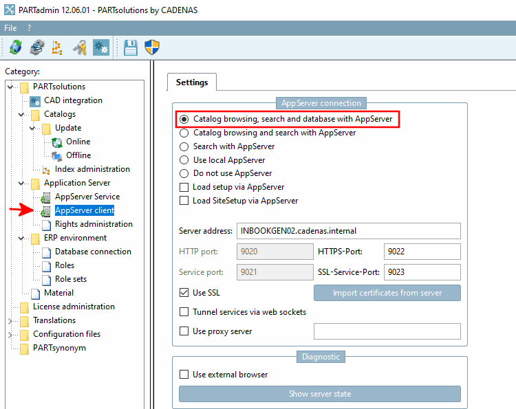 Per impostazione predefinita, l'opzione Cataloghi, ricerca e database tramite AppServer [Catalog browsing, search and database with AppServer] è impostata nella pagina della scheda Impostazioni [Settings] alla voce Connessione ad AppServer [AppServer connection].