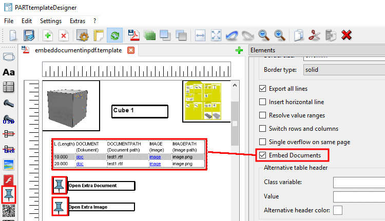 Attivare la casella di controllo Incorpora documenti [Embed Documents] in PartTemplateDesigner in Elementi [Elements] -> Tabella [Table].