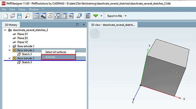 Selezionare l' estrusione di base desiderata e fare clic sul comando Disattiva [Deactivate] del menu contestuale.