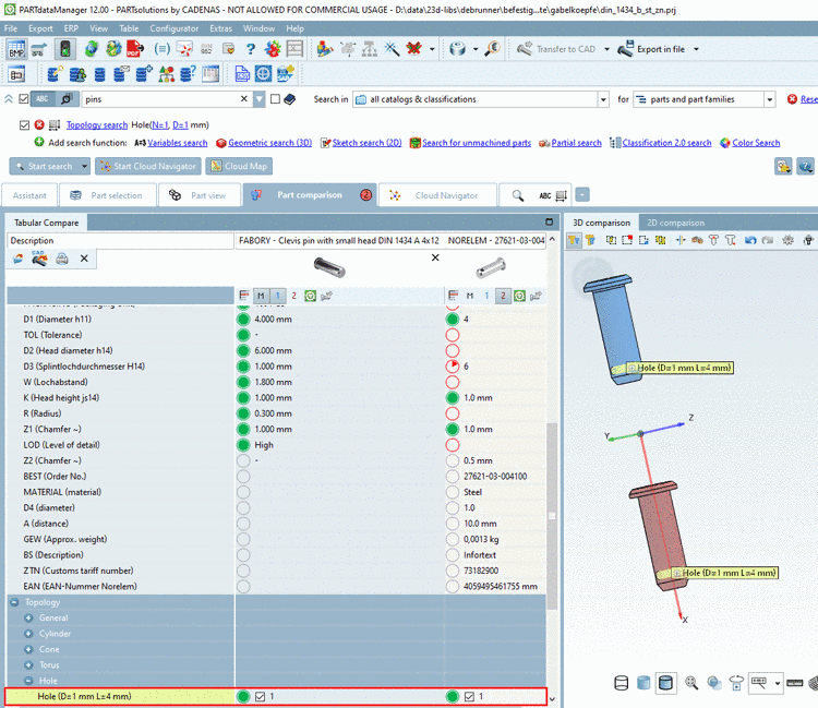 By default, the display of topological information in Part comparison is disabled. However, if search results of a Topology search are opened, the topological attributes under Tabular Compare are already marked, the respective checkboxes already selected and so the respective information in the 3D comparison displayed as well.