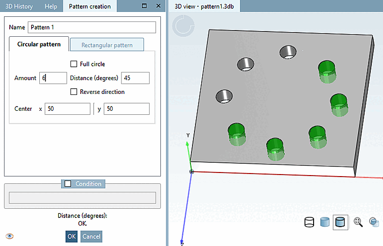 La procedura guidata per i modelli semplifica la creazione, la modifica e l'eliminazione di modelli circolari [Circular Pattern] e rettangolari [Rectangular pattern]. È compatibile anche con le versioni precedenti, poiché non vengono utilizzate nuove funzioni.