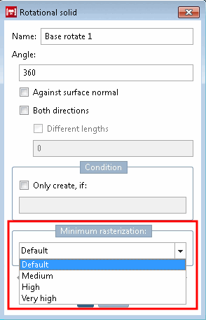 In alcune rare situazioni, può essere necessario aumentare la precisione della rasterizzazione minima all'interno di una parte per una caratteristica specifica, per poter creare una geometria specifica. Questa opzione di impostazione si trova in Solidi [Base], Taglio [Cut] e Sweep.