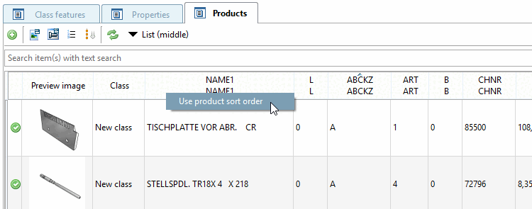 Se non vengono specificati attributi speciali per l'ordinamento dei prodotti, l'ordinamento si basa per impostazione predefinita sull'ID prodotto interno. Se si fa clic sull'intestazione di una colonna, l'ordinamento si basa su questo attributo.