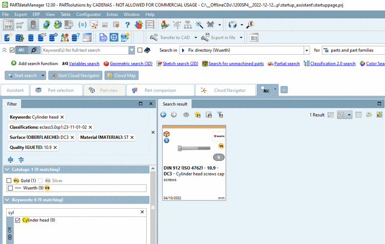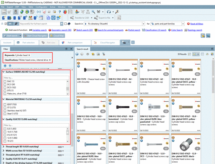 -> The more you specify the more variable filters are displayed (at screws e.g. nominal thread diameter and length, etc.).