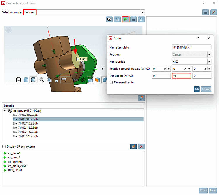 Punti [Connection points] di connessione: Selezionare questa opzione se si desidera determinare il nome di un punto di connessione. Quando viene selezionato nella vista 3D, il punto viene evidenziato nella parte inferiore dell'elenco.