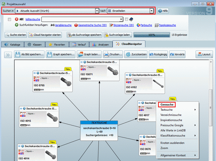 The results of the first search (here Text Search) and second search (here GeoSearch) can be compared side by side. With pressed mouse button you can move the graph as a whole or single nodes. At each node you can find the context menu command Zoom, wherewith you can move the desired node into the center.