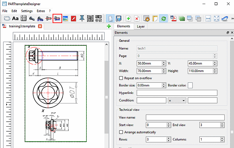 In alternativa, è possibile specificare un'area. Selezionare il valore per Vista finale [End view] sufficientemente grande in modo che le viste tecniche possano essere visualizzate in ogni caso.