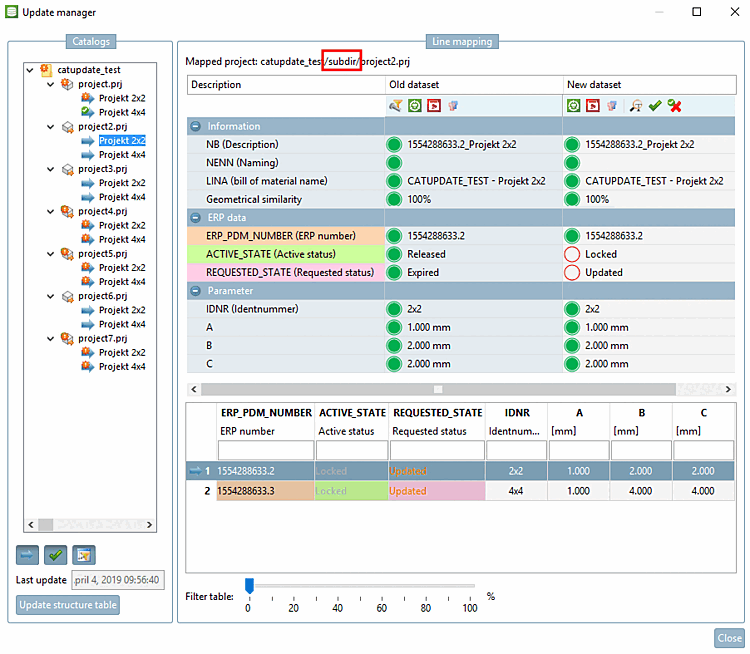 Nella Gestione aggiornamenti [Update manager], è possibile riconoscere una mappatura riuscita dal fatto che sia la colonna del vecchio record di dati [Old dataset] che quella del nuovo record di dati [New dataset] contengono dati nell'area di dialogo Assegnazione righe [Line mapping].