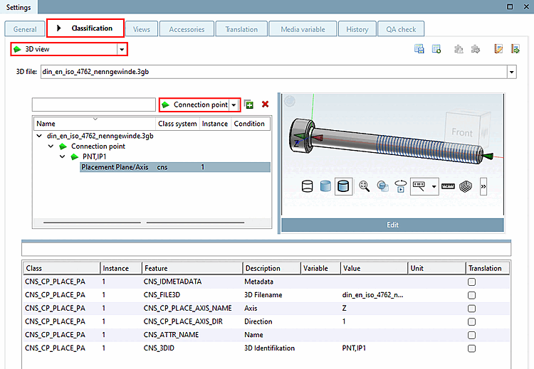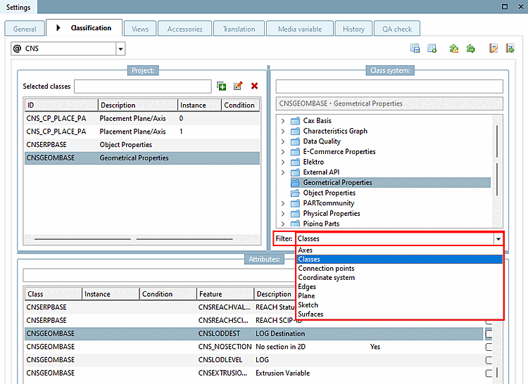 La Classificazione CADENAS (CNS) non è direttamente visibile nel PARTdataManager, ma un gran numero di funzioni sono controllate attraverso le caratteristiche della classe assegnata.
