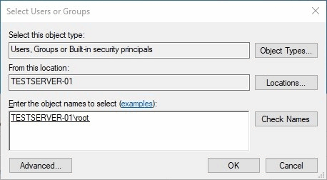 Dopo aver selezionato , si dovrebbe ottenere un risultato nella casella Inserisci i nomi degli oggetti da selezionare nel formato "HOSTNAME\username", come in questo esempio "TESTSERVER-01\root".