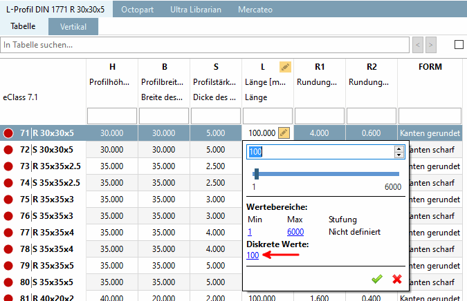 L'intervallo di valori viene visualizzato nel PARTdataManager alla voce Intervalli di valori [Value ranges] ; il valore predefinito viene visualizzato anche alla voce Valori discreti [Discrete values].