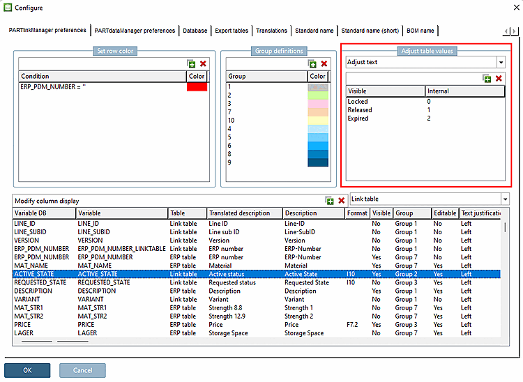 L'impostazione tramite l'interfaccia utente si effettua in PARTlinkManager -> Menu Extra [Extras] -> Finestra di dialogo Configura [Configure] -> Scheda Impostazioni PARTlinkManager [PARTlinkManager preferences] -> Area di dialogo Regola valori tabella [Adjust table values] -> Regola testo [Adjust text] selezione campo elenco: