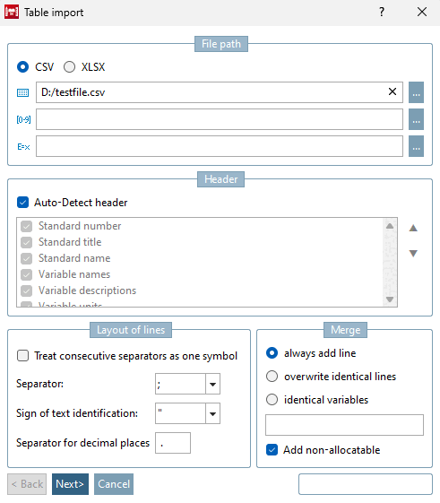 Se la casella di controllo Rileva automaticamente le intestazioni [Auto-Detect header] è attivata, si cerca di rilevare automaticamente le intestazioni da importare all'apertura del dialogo (o all'attivazione della casella di controllo). Questo include sia le intestazioni da importare che la loro sequenza. Se tutte le righe della prima colonna possono essere identificate, la casella di controllo viene attivata e la configurazione manuale delle intestazioni viene disattivata. In caso contrario, la casella rimane disattivata e l'utente deve specificare manualmente l'intestazione. Il sistema visualizzerà i messaggi di notifica corrispondenti.