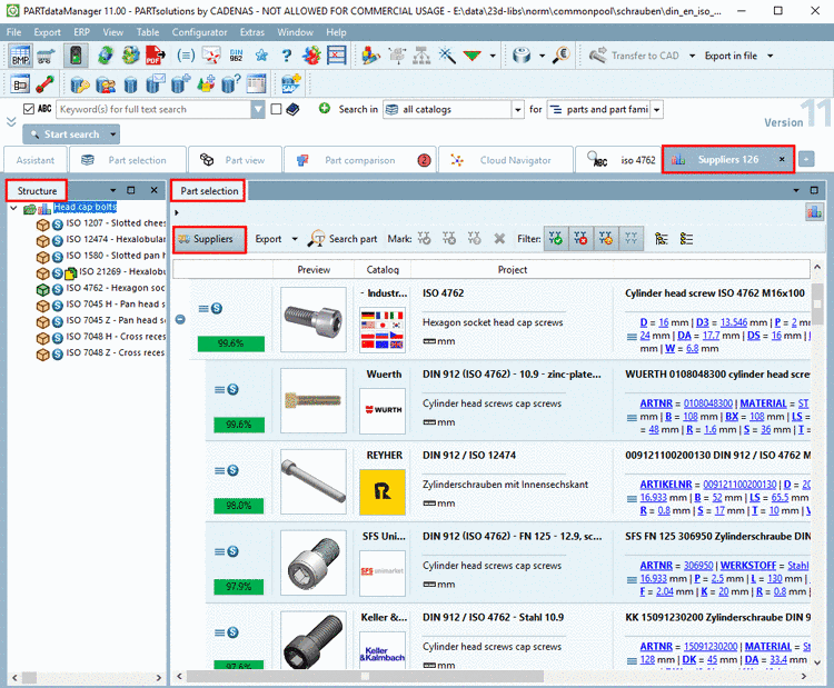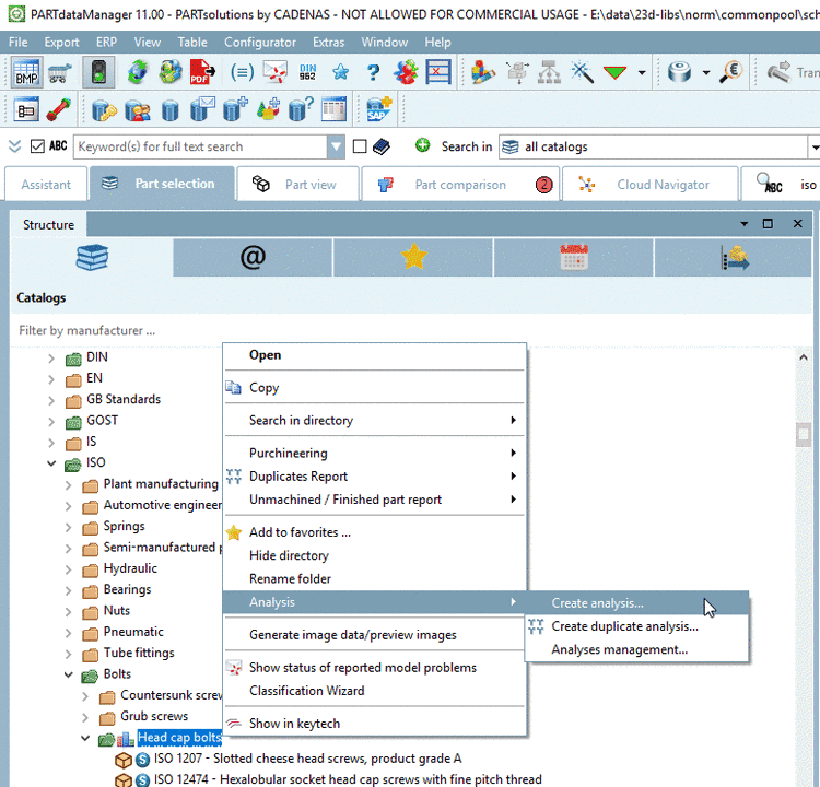 Under Part selection all search parts of the set directory are listed. When clicking on a plus sign