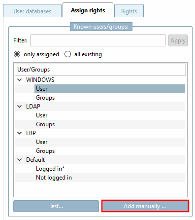 In un ambiente client-server, la scheda Assegnazione dei diritti [Assign rights] controlla anche quali categorie devono essere visualizzate in PARTadmin sui client nell'area di dialogo Categoria [Category].