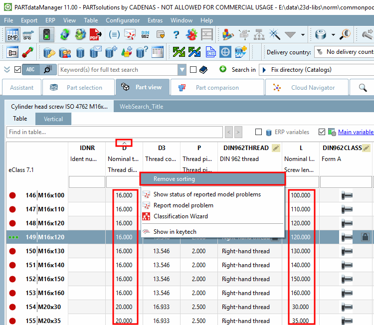 In PARTdataManager, l'ordinamento può essere determinato individualmente utilizzando i pulsanti freccia sopra ogni colonna della tabella. Fare clic su Annulla ordinamento [Remove sorting] per tornare all'ordinamento predefinito definito in PARTdesigner.