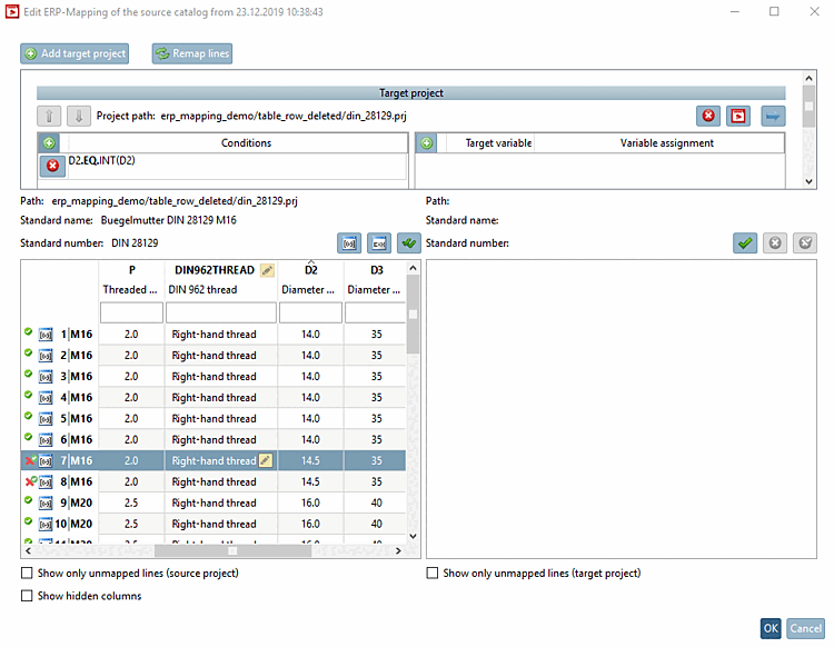Selezionare le righe con Progetto di destinazione: > la tabella del progetto di destinazione viene visualizzata a destra. La riga corretta è evidenziata