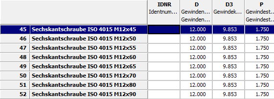 IDNR;NENN;DG;GK;DA;DK;DW;X;H;M;S;T Identifikationsnummer;Zeilenbeschreibung;Gewindenenndurchmesser;...;.....;... ;;mm;mm;mm;mm;mm;mm;mm;mm;mm;mm T;T;Z;Z;Z;Z;Z;Z;Z;Z;Z;Z 1;M4;4;3.242;4.6;6.5;5.8;1.4;8;3.2;7;5.26 2;M5;5;4.134;5.75;7.5;6.8;1.6;10;4;8;7.21 3;M6;6;4.917;6.75;9.5;8.3;2;12;5;10;7.71 4;M8;8;6.647;8.75;12.5;11.3;2.5;15;6.5;13;10.65 5;M10;10;8.376;10.8;15;14.3;3;18;8;16;12.65