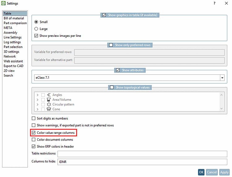Se questa opzione è attivata, anche le variabili della classe vengono visualizzate nelle rispettive intestazioni di colonna allo stesso modo della classificazione specificata (eClass 7.1 in questo esempio). Questa funzionalità è disponibile anche per le classificazioni personalizzate. Per informazioni dettagliate al riguardo, consultare la sezione Sezione 5.12.12, “Creare o modificare il proprio sistema di classi ” in eCATALOG 3Dfindit.