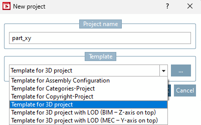 Inserire un nome di progetto nella finestra di dialogo Nuovo progetto [New project] e selezionare il modello di progetto 3D [Template for 3D project].