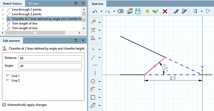 Determinare la distanza [Distance] (lunghezza dello smusso) e l' angolo [Angle] nella finestra Modifica elemento [Edit element].