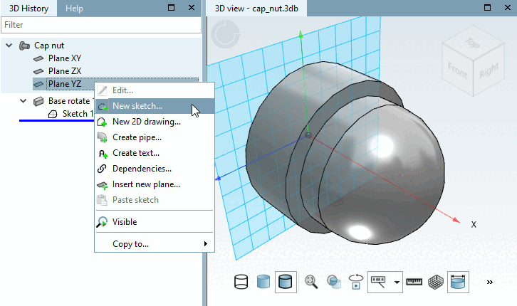 Nell'area di dialogo della cronologia 3D [3D History], fare clic sul piano YZ con il tasto secondario del mouse.