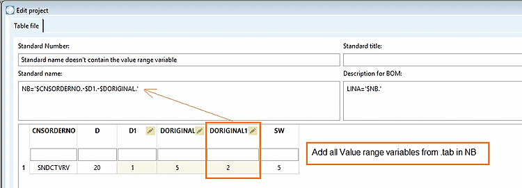 Soluzione: inserire tutte le variabili dell'intervallo di valori della tabella di progetto nella denominazione standard (NB).