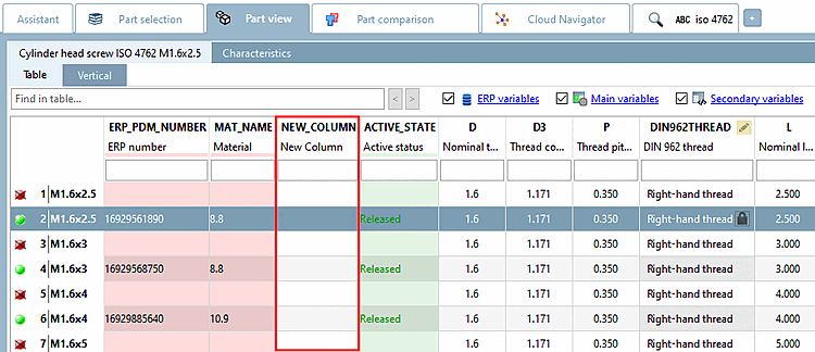 Affinché la colonna venga visualizzata in PARTdataManager, devono essere soddisfatti due requisiti: