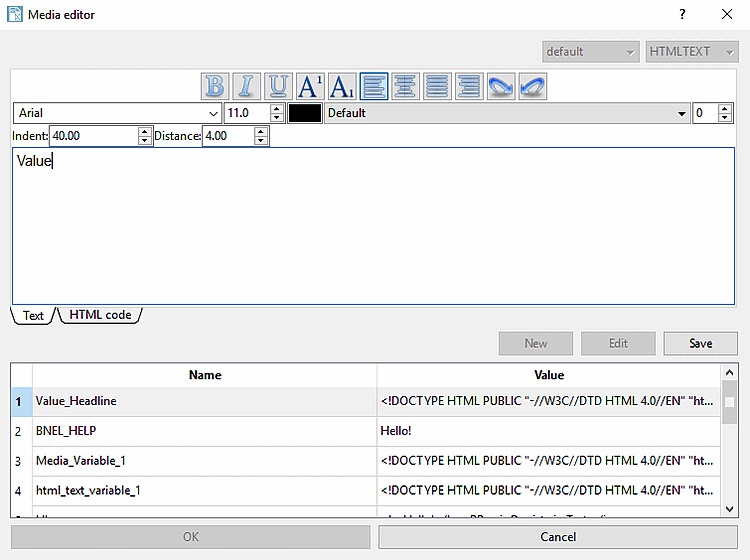 Il Media Editor [Media editor] contiene le funzionalità per la creazione e la modifica delle variabili multimediali. Questa opzione è disponibile anche in PARTproject. Il vantaggio dell' Editor [Media editor] multimediale: interfaccia chiara e possibilità di lavorare più velocemente. Sezione 5.9.17.3, “Copiare (ereditare) modelli e dati variabili ” Tuttavia, le impostazioni effettuate qui si riferiscono al progetto di prova e devono poi essere ereditate a livello di catalogo in PARTproject (vedere ).