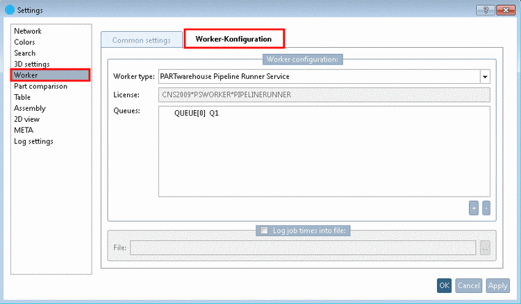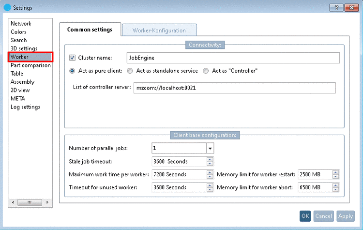 Memory limit for worker restart: Especially when running the conversion with a CAD system, the value should be increased. The message "Controller said kill job…" indicates that the job is running our of memory.