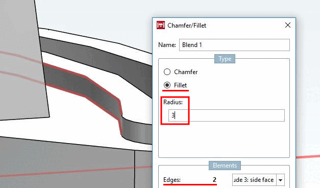 Definizione del raggio [Radius] di smusso/arrotondamento "a" (qui 6 mm)