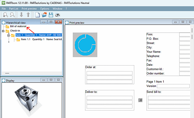 -> PARTbom viene aperto e mostra la parte trasferita come sottodirectory della cartella Checkin [Check-in] nell'area del menu della vista gerarchica [Hierarchical view].