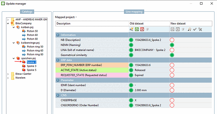 Non appena viene selezionata una determinata caratteristica nella struttura della directory, la corrispondenza mancante è visibile anche a destra nell'area di dialogo Assegnazione delle righe [Line mapping]: