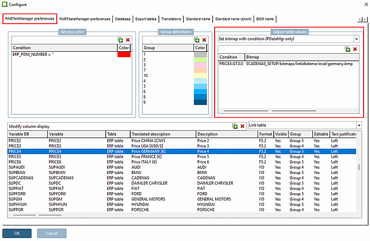 Impostazione nell'interfaccia utente sotto PARTlinkManager -> Menu Extra [Extras] -> Finestra di dialogo Configura [Configure] -> Pagina delle impostazioni di PARTlinkManager [PARTlinkManager preferences] -> Regola i valori della tabella [Adjust table values] -> Imposta bitmap con condizione (solo PDataMgr) [Set bitmap with condition (PDataMgr only)]