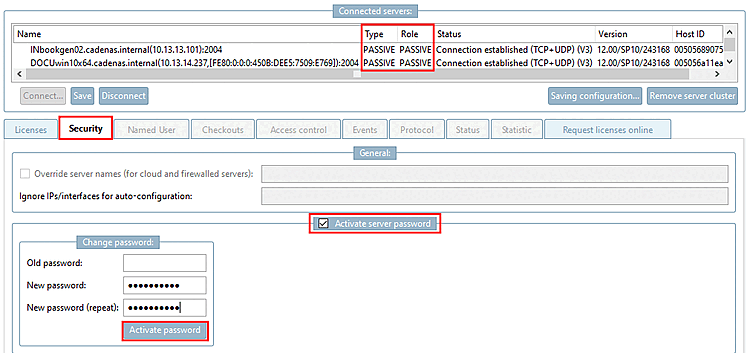 I server di licenza selezionati vengono visualizzati nell'area di dialogo Server collegati [Connected servers] (tipo e ruolo sono ancora impostati su PASSIVO).