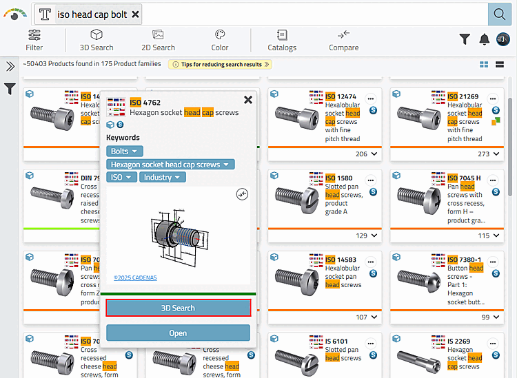 Richiamare la ricerca 3D direttamente dalla vista dei pezzi tramite il pulsante . Selezionare o .