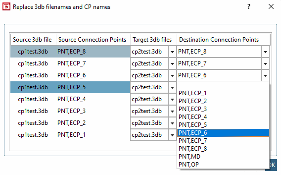 Caso speciale: quando si copiano i dati dei punti di connessione, si apre la finestra di dialogo Sostituisci nomi file 3db e nomi CP [Replace 3db filenames and CP names].