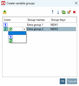 → I gruppi sono ora visualizzati nella finestra di dialogo Variabili [Variables] → "Crea gruppi di variabili [Create variable groups]".