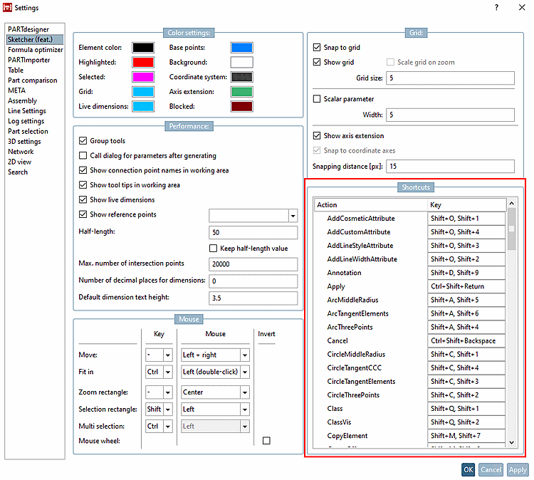 È possibile modificare le impostazioni predefinite in PARTdesigner -> Menu Extra [Extras] -> Impostazioni [Preferences...]... -> Sketcher (hist.) [Sketcher (feat.)] -> Mouse.