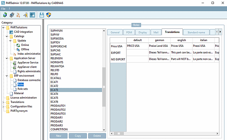 Nell'area di dialogo Ruoli [Roles], selezionare il ruolo "ECAT3" e la pagina della scheda Traduzioni [Translations].