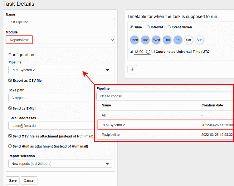 Pipeline: Nella casella di riepilogo, selezionare una pipeline specifica per la quale salvare i report o l'opzione "Tutte" per tutte le pipeline.