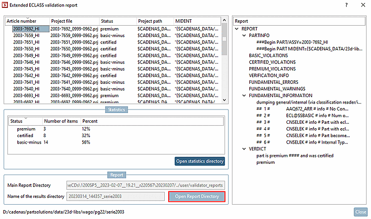 statistics.xlsx. Dopo aver cliccato su è questa già selezionato.È possibile aprire la directory dei rapporti corrente direttamente dalla finestra di dialogo dei rapporti di convalida ECLASS estesi [Extended ECLASS validation report].
