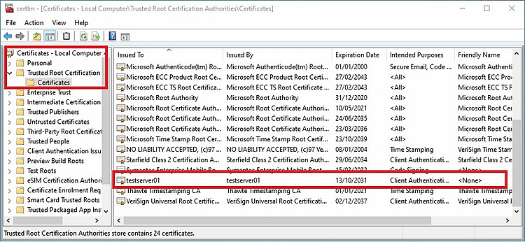 Il certificato creato deve essere disponibile sul server e sui client nel Gestore certificati di Windows.