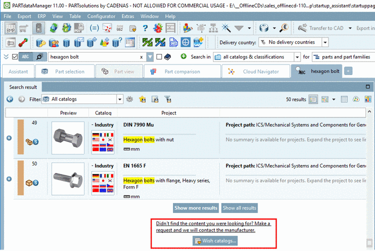 In this mode you can access both the part family and the contained characteristics. First the result list is displayed compactly only with part families. However, when you click on the