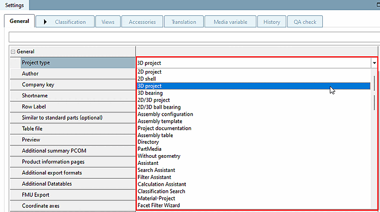 Fare clic sulla freccia per aprire il campo dell'elenco con i tipi di progetto. Selezionare il tipo desiderato dall'elenco.