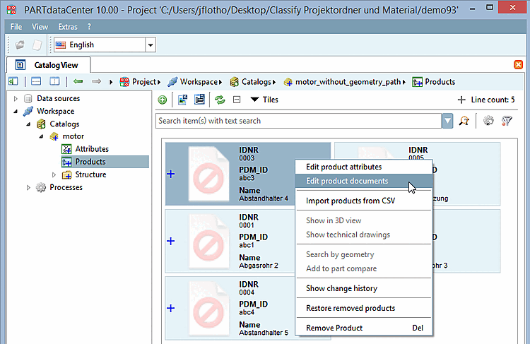 La chiamata viene effettuata in PARTdataCenter tramite il comando del menu contestuale Modifica documenti di prodotto [Edit documents in product] -> Aggiungi disegno tecnico [Add technical view].